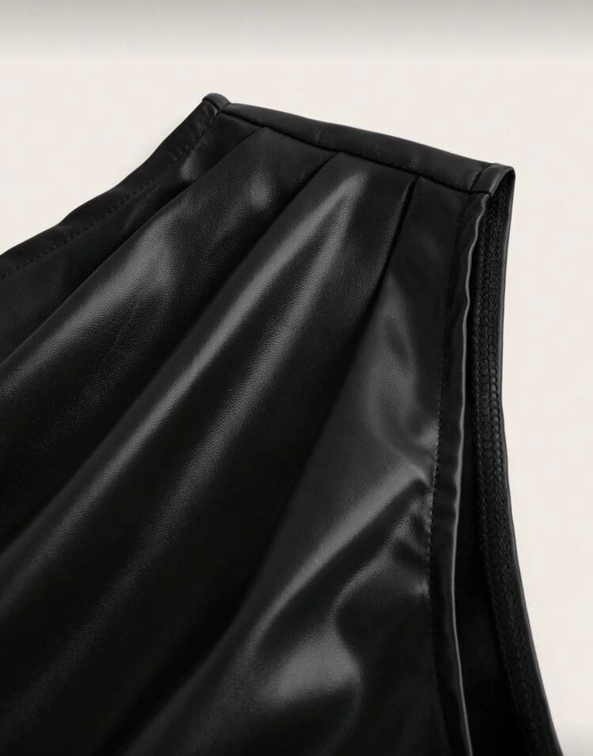 Blusa en cuerina color negro, de corte asimétrico que aporta un toque único y moderno. Cuenta con una cremallera lateral que facilita el uso y permite un ajuste perfecto al cuerpo.