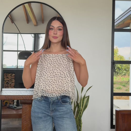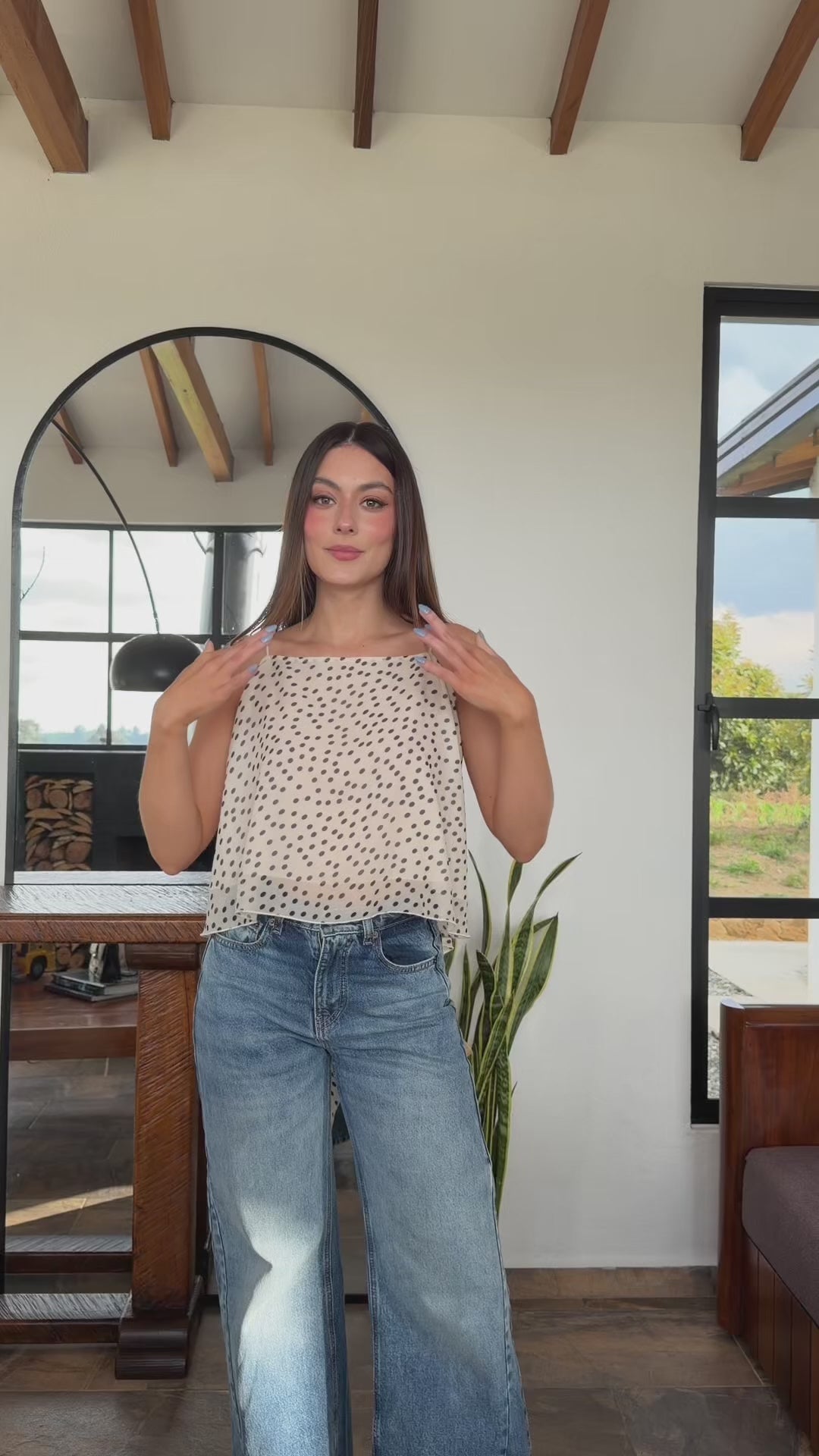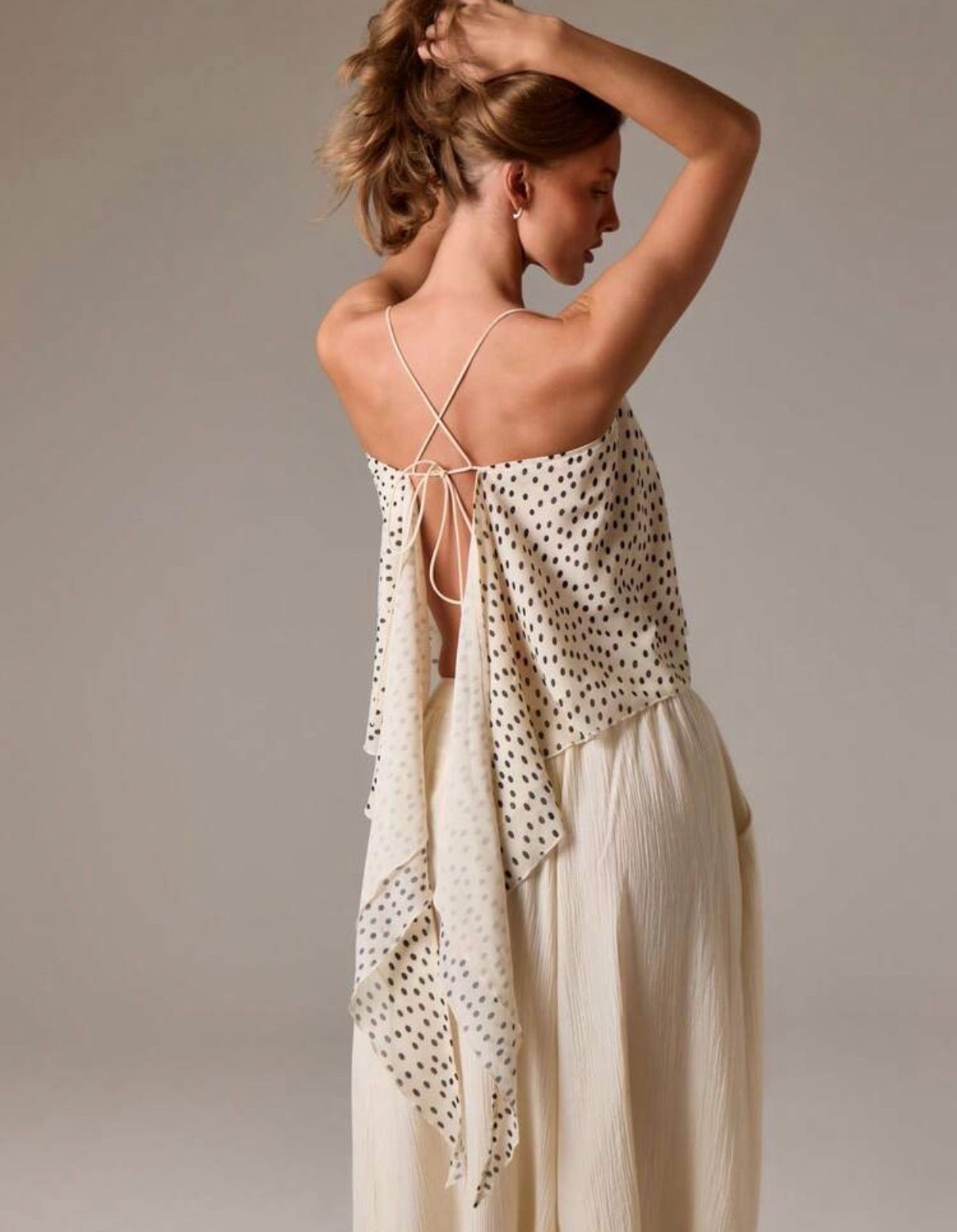 Blusa de tirantes finos confeccionada en tela ligera y fluida, con estampado de lunares. Presenta escote recto al frente y espalda descubierta con tirantes cruzados y lazo ajustable. Su diseño incorpora una caída suelta con panel posterior alargado que aporta movimiento y un acabado asimétrico delicado.