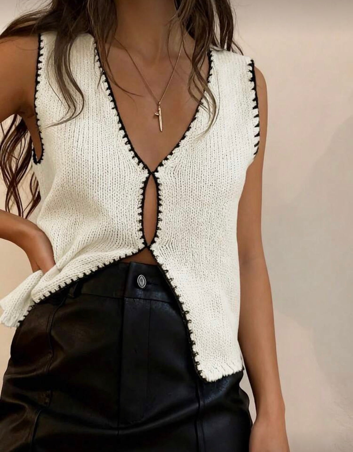 Este chaleco tejido combina tonos negro y blanco en un diseño atemporal, elaborado en lana peinada para ofrecer calidez sin perder ligereza.
