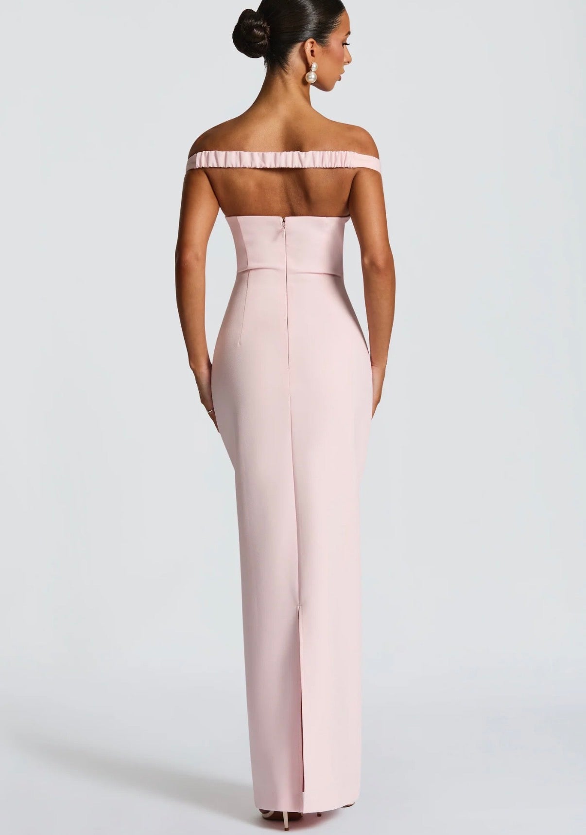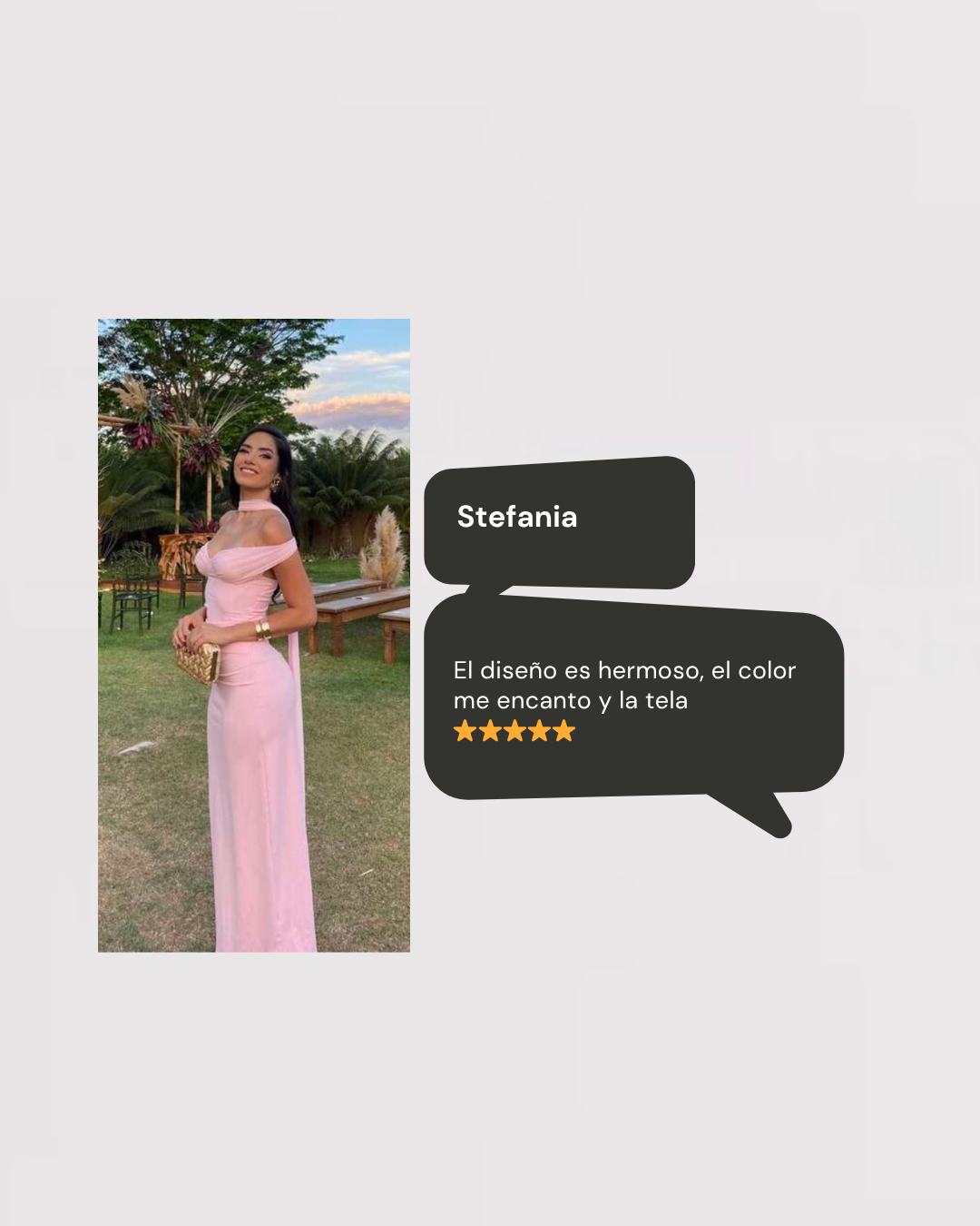 Vestido largo en tela stretch, diseñado para ajustar y estilizar la figura. Cuenta con escote corazón con tirantes caídos y un velo de mesh que rodea el cuello para un toque sofisticado. La parte superior es entallada, con drapeado que realza la cintura. La falda cae de forma recta y elegante, e incluye cremallera oculta atrás y abertura posterior para mayor comodidad y movimiento.
