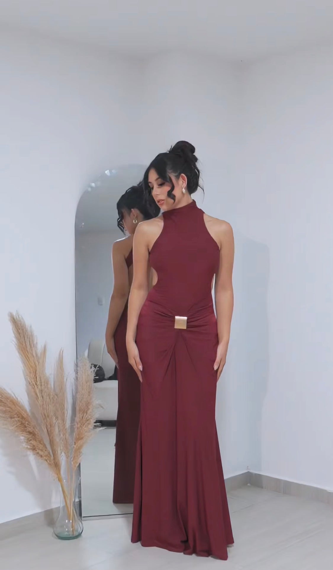 Este vestido largo en color burdeos destaca por su silueta estilizada y detalles sofisticados. En la parte superior, presenta un corte ajustado con cuello alto y espalda descubierta, aportando un toque sensual y moderno. La falda también entalla la figura, con un recogido en la parte trasera que realza las curvas y culmina en una caída amplia y fluida. Al frente, una hebilla dorada añade un detalle de lujo que eleva el diseño.