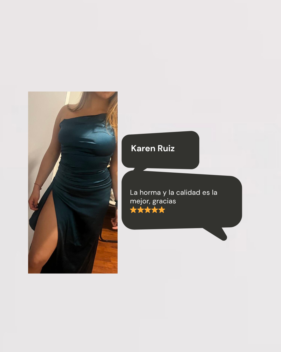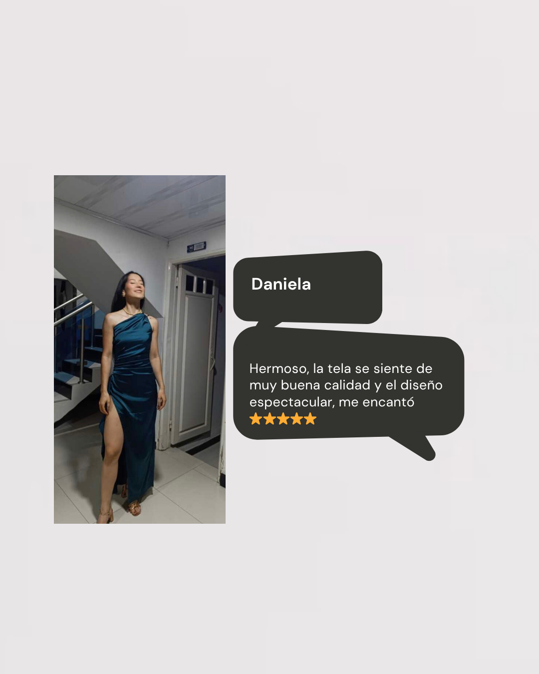 El vestido sarinado en color verde esmeralda, confeccionado en tela satinada. Con un diseño asimétrico, espalda descubierta y abertura en la pierna, resalta la figura de manera elegante. Su diseño es largo, ceñido al cuerpo, y cuenta con cremallera invisible a un lado para mayor comodidad.